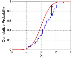 On modélise une loi donnée par sa fonction de répartition F (voir courbe rouge sur la figure). La fonction de répartition associe à tout x (en abscisses), la probabilité qu'une variable suivant cette loi soit plus petite que x (en ordonnées). Le test consiste alors à comparer la fonction de répartition de la loi (fonction de répartition théorique) à la fonction de répartition empirique Fn (en bleu). Cette dernière est une fonction de répartition obtenue en attribuant la probabilité 1/n à chacun des n éléments de l'échantillon. On mesure alors la différence entre les deux courbes. Si cette différence est inférieure à un seuil, alors on décide que l'échantillon provient bien de cette loi donnée. Plus précisément, on rejette l'hypothèse que l'échantillon provienne de la loi s'il y a une valeur de x pour laquelle |Fn(x) - F(x)| est grande.