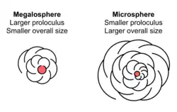 De nombreux foraminifères montrent un dimorphisme dans leurs tests, avec des individus soit mégalosphérique soit microsphérique. Ces noms fontt référence à la taille de la chambre initiale (ou proloculus), plutôt qu'à la taille de l'organisme entier.