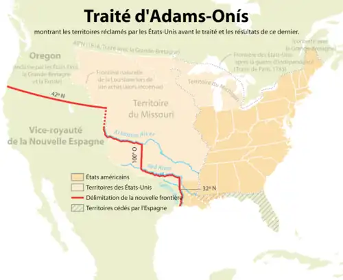 Les premiers contacts avec les Européens furent souvent pacifiques comme en témoigne l'étymologie du mot Texas : ce dernier vient en effet du caddo « tejas » qui signifie « allié » ou « ami[19],[20],[21],[22] ». Mais très vite, les troupes et les colons espagnols durent affronter les Apaches et les Comanches tout au long du XVIIIe siècle. Après leur indépendance en 1783, les États-Unis s'agrandirent vers l'ouest ; en 1795, la navigation commerciale sur le Mississippi fut ouverte aux Américains[23]. La vente de la Louisiane en 1803 consacra l'accroissement du territoire américain vers l'ouest. L'influence américaine se traduisit également par l’arrivée d’aventuriers comme Philip Nolan (1771-1801), de marchands, de scientifiques comme William Dunbar ou Peter Custis. Le traité d'Adams-Onís de 1819 fixa la frontière entre les territoires américain et espagnol.