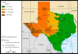 Le centre du Texas est constitué de plateaux et de hautes plaines, bordés par des escarpements (escarpement de Balcones, escarpement du Caprock) ; il représente une zone de transition entre les Grandes Plaines et les plaines côtières. Le plateau d'Edwards offre un relief karstique et se rattache aux Grandes Plaines[71]. Plus au nord se succèdent la Llano Estacado, considérée comme l'une des plus grandes mesas d'Amérique du Nord[72] et le panhandle, formé de hautes plaines et de plateaux disséqués par des gorges. Ici, le canyon de Palo Duro, le deuxième des États-Unis par ses dimensions, après celui du Colorado[73].