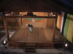 L'accès à la scène se fait pour les acteurs par le hashigakari, passerelle étroite à gauche de la scène, dispositif adapté ensuite au kabuki[9] en Chemin des fleurs (hanamichi). Considéré comme partie intégrante de la scène, ce chemin est fermé côté coulisses par un rideau à cinq couleurs. Le rythme et la vitesse d'ouverture de ce rideau donne au public des indications sur l'ambiance de la scène. La longueur du hashigakari impose des entrées spectaculaires. Cet élément ainsi que les propriétés de résonance de la scène obligent les acteurs à utiliser un pas glissé particulier, sans choc des pieds sur le sol et les hanches très basses.