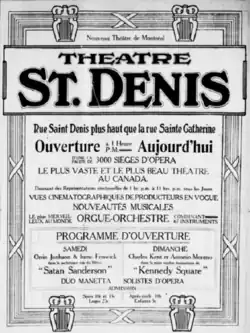 Conçu par Ernest Isbell Barott[1] et fondé par une compagnie anglophone montréalaise d’investissement, le Théâtre St-Denis ouvrite ses portes le [2]. Avec sa capacité de 3 000 places, le théâtre devint la plus grande salle au Canada et se consacra à la présentation de vaudeville et de cinéma muet[3].