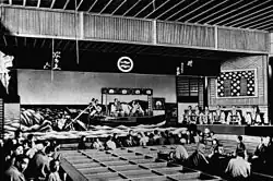 La scène de kabuki comprend une projection complète qui traverse le parterre du public jusqu’à l’arrière-salle nommée hanamichi (花道, littéralement « le chemin des fleurs »), utilisée pour les entrées et les sorties les plus spectaculaires, ainsi que les poses (mie) des vedettes[213],[214]. La révélation d’une identité secrète ou la transformation d’un personnage constituant un point crucial d’une grande partie des pièces du répertoire[215], les moyens de faire apparaître ou disparaître rapidement un acteur se sont multipliés à partir du XVIIIe siècle, sous la forme de dispositifs scéniques variés, comme des trappes (seri) ou des plateaux permettant de faire pivoter tout ou partie de la scène[216].