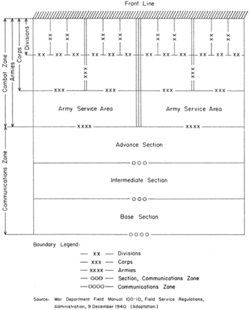 « Le terme « théâtre d'opération » était défini dans les manuels de combat [américains] comme les régions terrestres et maritimes à envahir ou à défendre, incluant les activités administratives concomitantes aux opérations militaires (voir figure intitulée Charte 12). Conformément à l'expérience de la Seconde Guerre mondiale, c'était généralement une grande surface terrestre où des opérations seraient menées en continu, surface divisée en deux parties principales : la zone de combat, ou zone de conflit, et la zone de communications, ou zone nécessaire à l'administration du théâtre. À la suite de l'avancée des armées, ces surfaces et les zones qui les partageaient seraient déplacées dans de nouveaux lieux géographiques qui serviraient de nouvelles zones de contrôle[trad 1]. »