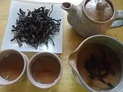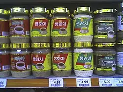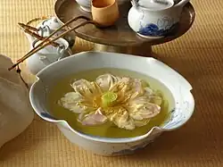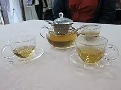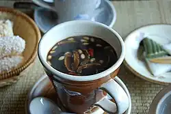 생강차 (saeng-gang cha), chinois 生薑茶 (Shēng jiāng chá). La tisane de gingembre (Zingiber officinale) est une infusion traditionnellement utilisée comme phytothérapie en Asie, sa saveur «est brûlante, poivrée et aromatique, elle réchauffe et rend service à toutes les occasions et saisons de l'année. Elle est stomachique, excitante, anti-infectieuses et sudorifique»[133]. On infuse du gingembre frais ou sec[134]15 min dans l'eau très chaude en la parfumant au zeste d'orange[135]. Cette boisson fait l'objet de publications académiques nombreuses dont son utilité contre le diabète de type 2 (2021)[136], la production de boisson aromatisée à la menthe[137], au thé vert[138].