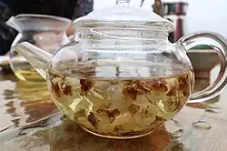 Camomille de Chine, Chrysanthemum indicum, 국화차 (gughwa cha), chinois 菊花茶 (júhuā chá). Il s'agit d'une fleur usuellement utilisée en médecine traditionnelle chinoise, son potentiel antioxydant a donné lieu en Corée à diverses études sur sa durée de torréfaction[67] ainsi que sa qualité organoleptique (qui est optimale ave 5 passages à la poêle)[68]. Le composant aromatique volatil prédominant est la chrysanthénone (10,01 %[69]. Une libération plus rapide des antioxydant actifs est obtenue avec une infusion à 50°C[70].