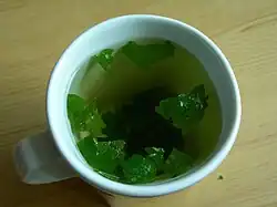 Mentha canadensis박하차 (bagha cha), chinois 薄荷茶 (bòhé chá). Cette tisane de menthe se prépare en Corée avec les feuilles de menthe sauvage. Les menthes sont des plantes médicinales associées aux boissons, leur huile essentielle est abondante en composés aromatiques: limonène, menthone, menthol[33] aux propriétés multiples qui en font un des additifs aromatiques les plus utilisés avec la vanille et les agrumes[34]. Cette tisane est spécialement riche en polyphénols[35].