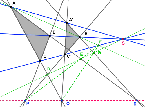 Les deux triangles ABC et A'B'C' sont en perspective depuis le point S, et leurs côtés homologues s'intersectent en