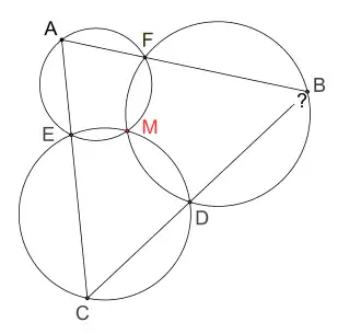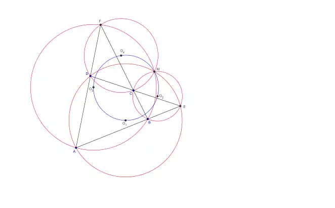 Théorème des trois cercles — Soient trois cercles (C1), (C2), (C3) se rencontrant en un point M, on appelle D, E et F les autres points d'intersection des cercles (C2) et (C3), (C3) et (C1), (C1) et (C2) respectivement. Soit A un point de (C1) tel que la droite (FA) recoupe (C2) en B et la droite (EA) recoupe (C3) en C. Alors les points B, D et C sont alignés.