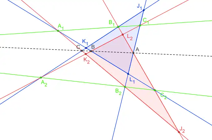 Une démonstration analogue peut être faite, en modifiant les conditions supplémentaires, avec le triangle (en rouge sur la figure). Dans ce cas, les trois droites , et (en rouge sur la figure) échangent leur rôle avec les trois droites , et (en bleu sur la figure).