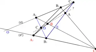 Or, une application projective d'une droite sur une autre est entièrement déterminée par l'image de trois points distincts. Les transformations q o p et r coïncident sur , D et . Elles sont donc égales et . Les points A, B et C sont donc alignés[1].