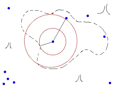 Les points bleus représentent les zéros de g(z). Les pics noirs sont les pôles. La ligne pointillée est la frontière de l'ouvert U (remarquez que tous les pôles sont extérieurs à U). Le petit cercle rouge est la frontière du disque B mentionné par la démonstration.