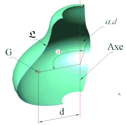 Premier théorème de Guldin  L'aire de la surface engendrée par la rotation d'un arc de courbe plane homogène autour d'un axe de son plan, axe ne traversant pas l'arc de courbe, est égale au produit de la longueur de l'arc de courbe par celle de l'arc de cercle décrit par son centre de gravité ou barycentre :