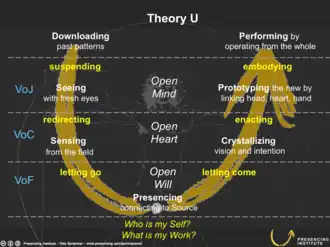 Scharmer propose de concevoir la théorie U comme un cheminement qui suit effectivement une forme de U. Il utilise le mot presencing pour le décrire[3].