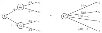 Cette propriété de mixage peut être vue comme une composition de loterie[30]. La loterie correspond à la loterie à deux étapes qui, dans un premier temps, offre les loteries et avec les probabilités et respectivement et, à la seconde étape, offre la conséquence . Cet axiome considère comme équivalent la loterie composée (à plusieurs étapes) et sa forme réduite (à une étape).