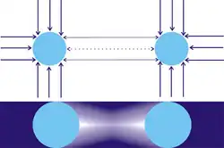 Cependant, lorsqu'un second objet, B, est présent, une partie des particules qui auraient frappé A du côté faisant face à B est intercepté par B, donc B agit comme un bouclier. Autrement dit, du côté faisant face à B, A sera frappé par moins de particules que du côté opposé. De la même façon, B sra frappé par moins de particules du côté faisant face à A que du côté opposé. On peut dire que A et B se font de l'ombre l'un à l'autre et que les deux corps sont poussés l'un vers l'autre par le déséquilibre de force induit (situation de l'illustration P2). Selon cette théorie, l'attraction apparente entre les deux corps est donc en réalité une poussée réduite du côté faisant face à l'autre corps, donc la théorie est parfois appelée « théorie de la poussée » ou « théorie de l'ombre », bien que l'on parle plus souvent de la théorie de la gravitation de Le Sage.