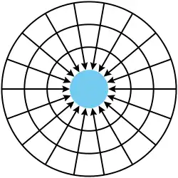 Étant donné que l'on suppose que certaines si ce n'est toutes les particules gravifiques convergeant vers un objet sont soit absorbées soit ralenties par l'objet, l'intensité du flux de particules gravitiques émanant de la direction d'un objet massif est moindre que celle du flux convergeant vers l'objet. On peut imaginer ce déséquilibre de flux de moment, et par conséquent de la force exercée par quelque autre corps dans le voisinage, comme étant distribué sur une surface sphérique centrée sur l'objet (illustration P4). Le déséquilibre de flux de moment sur une surface entièrement sphérique entourant l'objet est indépendante de la sphère encerclante, alors que la surface de la sphère augmente comme le carré du rayon. Par conséquent, le déséquilibre de moment par unité de surface diminue comme l'inverse du carré de la distance.