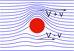 Si la tige est plongée dans un fluide en un mouvement uniforme rectiligne, la vitesse d'une particule est la somme de la vitesse d'entraînement autour de la tige et du mouvement uniforme. Au-dessous de la tige comme le montre l'illustration les particules se déplacent plus vite qu'au-dessus de la tige. Les lignes de courant se rapprochent de la tige au-dessous et s'écartent de la tige au-dessus.