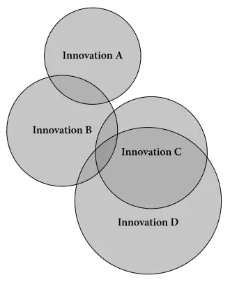 Ce diagramme d'Euler doit se lire comme une carte géographique, ou plus précisément dialectologique. Chaque cercle représente une innovation linguistique, comme des isoglosses sur une carte dialectale. À mesure qu'une innovation se répand dans le continuum dialectal, les cercles augmentent de diamètre au fil du temps, comme des ondes ou vagues sur la surface de l'eau frappée par une pierre. Les langues modernes résultent de l'accumulation, au fil du temps, des innovations linguistiques représentées par ces cercles ; par ex. dans ce schéma, une petite zone reflétera les innovations B, C et D. Les zones non recouvertes par des cercles sont les aires conservatrices, caractérisées par moins d'innovations depuis la langue ancestrale.