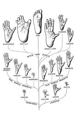 L'anatomie comparée du pied chez les primates montre l'origine préhensile du pied humain dont le raccourcissement des orteils et l'absence d'opposabilité de l'hallux font partie des adaptations pour la course.