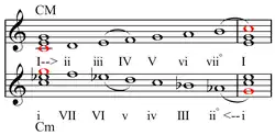 - La transformation N (pour Nebenverwandt) échange un accord majeur par sa sous-dominante mineure ou un accord mineur par sa dominante majeure (exemple : do majeur devient fa mineur et inversement). Cette transformation peut être obtenue en appliquant les transformations R, L puis P.