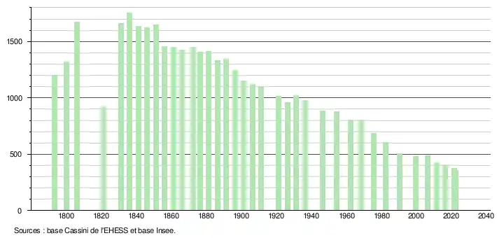 L'évolution du nombre d'habitants est connue à travers les recensements de la population effectués dans la commune depuis 1793. Pour les communes de moins de 10 000 habitants, une enquête de recensement portant sur toute la population est réalisée tous les cinq ans, les populations de référence des années intermédiaires étant quant à elles estimées par interpolation ou extrapolation[16]. Pour la commune, le premier recensement exhaustif entrant dans le cadre du nouveau dispositif a été réalisé en 2006[17].