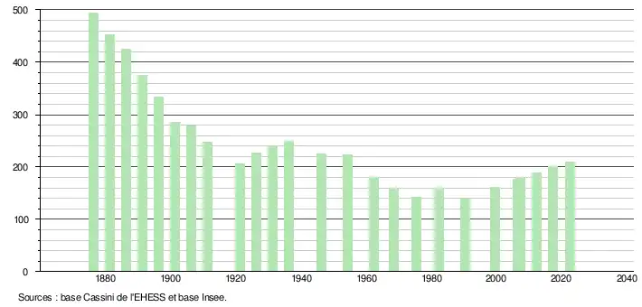 L'évolution du nombre d'habitants est connue à travers les recensements de la population effectués dans la commune depuis 1876. Pour les communes de moins de 10 000 habitants, une enquête de recensement portant sur toute la population est réalisée tous les cinq ans, les populations de référence des années intermédiaires étant quant à elles estimées par interpolation ou extrapolation[22]. Pour la commune, le premier recensement exhaustif entrant dans le cadre du nouveau dispositif a été réalisé en 2007[23].
