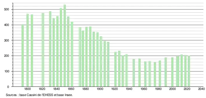 L'évolution du nombre d'habitants est connue à travers les recensements de la population effectués dans la commune depuis 1793. Pour les communes de moins de 10 000 habitants, une enquête de recensement portant sur toute la population est réalisée tous les cinq ans, les populations de référence des années intermédiaires étant quant à elles estimées par interpolation ou extrapolation[20]. Pour la commune, le premier recensement exhaustif entrant dans le cadre du nouveau dispositif a été réalisé en 2007[21].