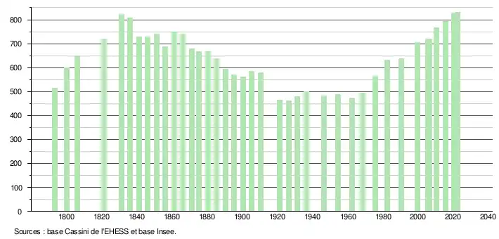 L'évolution du nombre d'habitants est connue à travers les recensements de la population effectués dans la commune depuis 1793. Pour les communes de moins de 10 000 habitants, une enquête de recensement portant sur toute la population est réalisée tous les cinq ans, les populations de référence des années intermédiaires étant quant à elles estimées par interpolation ou extrapolation[17]. Pour la commune, le premier recensement exhaustif entrant dans le cadre du nouveau dispositif a été réalisé en 2005[18].