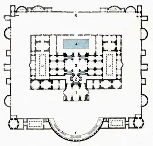 Les deux axes de symétrie du complexe se croisaient au centre de la très vaste basilique (ou frigidarium, salle basilicale). L'axe majeur se prolongeait au sud-ouest vers les différents bains (tepidarium, caldarium), tandis que l'axe mineur (nord-ouest/sud-est) s'ouvrait sur les gymnases (palaestrae).