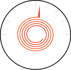 Dans le thermomètre à spirale, la lame est enroulée, une de ses extrémités est fixée au centre d'un cadran et l'autre, en forme de pointe, est libre. Un cadran gradué est placé derrière la lame en spirale. Lorsqu'elle se dilate ou se contracte sous l'effet de la température, la géométrie en spirale convertit cette dilatation en une rotation de l'aiguille sur un cadran gradué.
