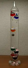 Le thermomètre de Galilée est composé de flotteurs d'une densité moyenne proche du liquide dans lequel ils sont immergés. Lorsque le liquide du tube se dilate avec la température, il devient moins porteur, ce qui fait couler certains flotteurs. Plusieurs flotteurs lestés différemment peuvent montrer les températures différentes.