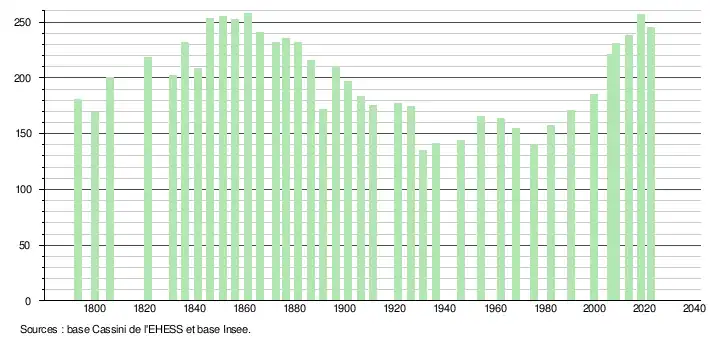 L'évolution du nombre d'habitants est connue à travers les recensements de la population effectués dans la commune depuis 1793. Pour les communes de moins de 10 000 habitants, une enquête de recensement portant sur toute la population est réalisée tous les cinq ans, les populations de référence des années intermédiaires étant quant à elles estimées par interpolation ou extrapolation[16]. Pour la commune, le premier recensement exhaustif entrant dans le cadre du nouveau dispositif a été réalisé en 2008[17].