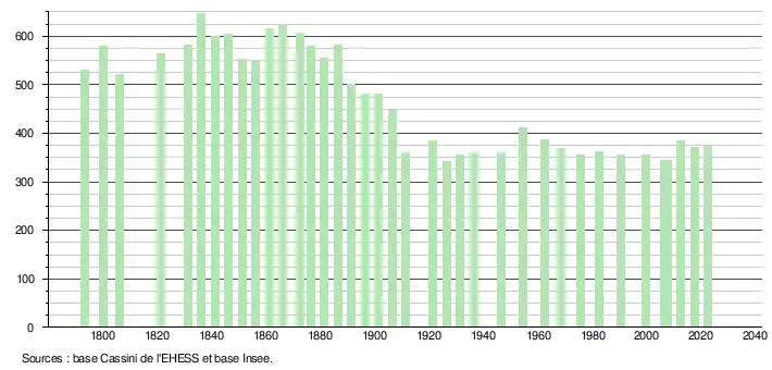 L'évolution du nombre d'habitants est connue à travers les recensements de la population effectués dans la commune depuis 1793. Pour les communes de moins de 10 000 habitants, une enquête de recensement portant sur toute la population est réalisée tous les cinq ans, les populations de référence des années intermédiaires étant quant à elles estimées par interpolation ou extrapolation[23]. Pour la commune, le premier recensement exhaustif entrant dans le cadre du nouveau dispositif a été réalisé en 2007[24].