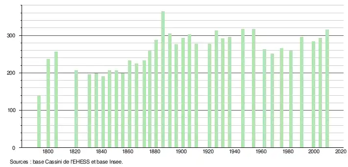 L'évolution du nombre d'habitants est connue à travers les recensements de la population effectués dans la commune depuis 1793. À partir du , les populations légales des communes sont publiées annuellement dans le cadre d'un recensement qui repose désormais sur une collecte d'information annuelle, concernant successivement tous les territoires communaux au cours d'une période de cinq ans. Pour les communes de moins de 10 000 habitants, une enquête de recensement portant sur toute la population est réalisée tous les cinq ans, les populations légales des années intermédiaires étant quant à elles estimées par interpolation ou extrapolation[13]. Pour la commune, le premier recensement exhaustif entrant dans le cadre du nouveau dispositif a été réalisé en 2004[14],[Note 2].