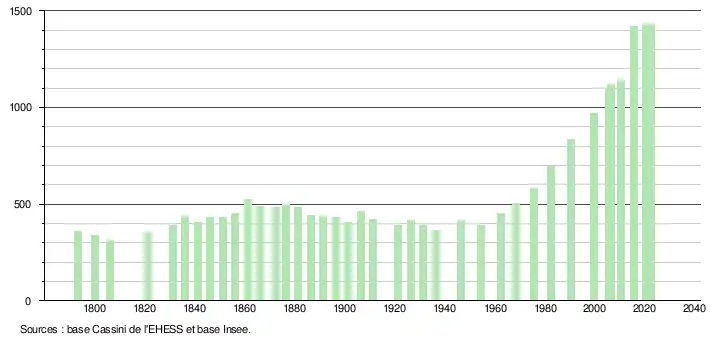 L'évolution du nombre d'habitants est connue à travers les recensements de la population effectués dans la commune depuis 1793. Pour les communes de moins de 10 000 habitants, une enquête de recensement portant sur toute la population est réalisée tous les cinq ans, les populations de référence des années intermédiaires étant quant à elles estimées par interpolation ou extrapolation[18]. Pour la commune, le premier recensement exhaustif entrant dans le cadre du nouveau dispositif a été réalisé en 2005[19].