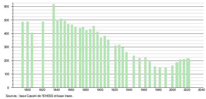 L'évolution du nombre d'habitants est connue à travers les recensements de la population effectués dans la commune depuis 1793. Pour les communes de moins de 10 000 habitants, une enquête de recensement portant sur toute la population est réalisée tous les cinq ans, les populations de référence des années intermédiaires étant quant à elles estimées par interpolation ou extrapolation[13]. Pour la commune, le premier recensement exhaustif entrant dans le cadre du nouveau dispositif a été réalisé en 2005[14].