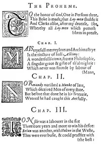 - ↑ « Alchymista suo tempore peritissimus and much more curious in the study of Philosophy than others, yet they pass some undecent and abusive censures upon him, with reference to his vaine and frivolous Science, as they please to tearme it. »