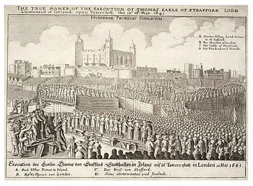 Strafford affronta son destin deux jours plus tard à Tower Hill, recevant les derniers sacrements de l’archevêque Laud, qui était lui-même prisonnier à la Tour de Londres. Thomas Wentworth fut décapité devant une foule de 200 000 personnes le . Un de ses parents, Thomas Wentworth (1er comte de Cleveland), qui devait plus tard combattre dans les rangs du roi au début de la Guerre civile, assistait à l’exécution. À l'annonce de l'exécution de l'ancien gouverneur, en , l’Irlande se souleva de nouveau, et de nouveau le Parlement et le roi marchandèrent sur la mobilisation d'une armée.