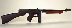 De son côté, l’United States Army rejette d’abord l’arme après un examen en 1924[33]. Un réexamen en 1931 amène à un revirement et la Thompson est adoptée de manière limitée pour la cavalerie en , mais sans entraîner pour autant de commande[34]. L’adoption complète a lieu en 1938 sous la désignation Gun, Submachine, Caliber .45, Model of 1928A1 lorsque l’US Army constate que le M1 Garand ne peut être utilisé efficacement à bord des véhicules[14]. Les commandes débutent en avec 950 exemplaires, porté à 20 405 à la fin de l’année 1940[35].