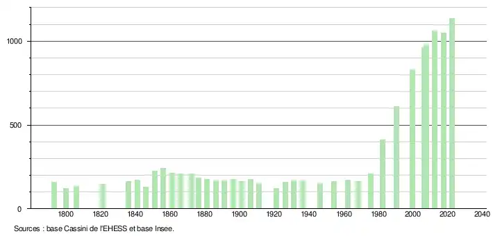 L'évolution du nombre d'habitants est connue à travers les recensements de la population effectués dans la commune depuis 1793. Pour les communes de moins de 10 000 habitants, une enquête de recensement portant sur toute la population est réalisée tous les cinq ans, les populations de référence des années intermédiaires étant quant à elles estimées par interpolation ou extrapolation[14]. Pour la commune, le premier recensement exhaustif entrant dans le cadre du nouveau dispositif a été réalisé en 2007[15].