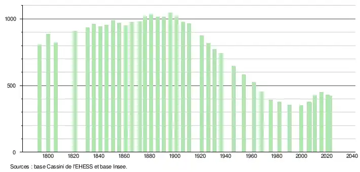 L'évolution du nombre d'habitants est connue à travers les recensements de la population effectués dans la commune depuis 1793. Pour les communes de moins de 10 000 habitants, une enquête de recensement portant sur toute la population est réalisée tous les cinq ans, les populations de référence des années intermédiaires étant quant à elles estimées par interpolation ou extrapolation[15]. Pour la commune, le premier recensement exhaustif entrant dans le cadre du nouveau dispositif a été réalisé en 2005[16].
