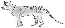 Le thylacine[1], également appelé loup marsupial, loup de Tasmanie ou tigre de Tasmanie (en palawa kani : kaparunina, nom scientifique : Thylacinus cynocephalus), est un mammifère carnivore de la taille d’un loup, au pelage tigré. Ce marsupial n'appartient pas à l'ordre placentaire des Carnivora et n'est donc pas un Canidé, mais à l'ordre des Dasyuromorphia. Depuis 1936, l’espèce est considérée comme éteinte ; cependant les amateurs de cryptozoologie ont espéré prouver la présence de thylacines en Tasmanie en 2013[2], puis plus récemment en 2017 et en 2018[3],[4].