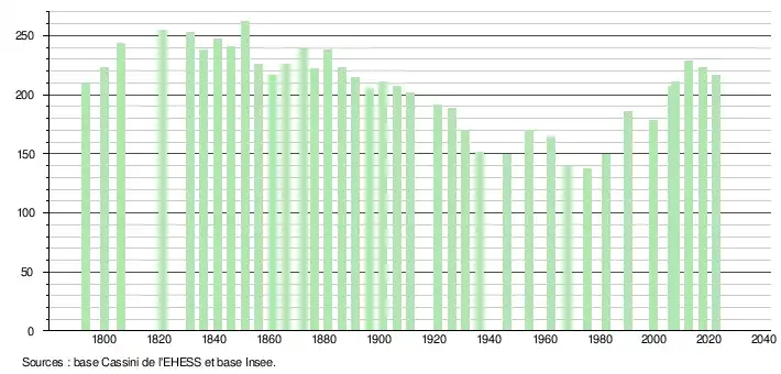 L'évolution du nombre d'habitants est connue à travers les recensements de la population effectués dans la commune depuis 1793. Pour les communes de moins de 10 000 habitants, une enquête de recensement portant sur toute la population est réalisée tous les cinq ans, les populations de référence des années intermédiaires étant quant à elles estimées par interpolation ou extrapolation[28]. Pour la commune, le premier recensement exhaustif entrant dans le cadre du nouveau dispositif a été réalisé en 2007[29].