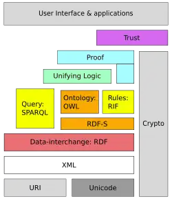 La naissance du W3C lors de la première conférence internationale du WWW est concomitante avec une nouvelle idée forte de Tim Berners-Lee: le Web sémantique. Lors de cette conférence, il explique que « le Web a besoin de sémantique »[22] : il cherche à dépasser la logique de l'hypertexte dans la perspective de lier le Web au monde réel par la sémantique. Il pose ainsi les premières bases théoriques du Web sémantique qui se concrétisent quelques années plus tard avec deux brouillons de recommandations à ce sujet en 1997[23] et 1998[24]. Ils sont issus de groupes de travail de la W3C qui impliquent des contributeurs provenant d'entités diverses (IBM, Nokia, Microsoft, Netscape, Reuters, etc.). En 1998, Tim Berners-Lee met en place ce qu'il appelle le « Semantic Web roadmap »[25] (« feuille de route du Web sémantique ») où il élabore les différents objectifs techniques afin de parvenir à la mise en place de ce qu'il considère comme une base de données globale à l'échelle du réseau. Pour cela, il faut créer un lien entre l'usager qui doit se trouver dans un espace de collaboration et de coopération, d'une part, et les machines qui doivent saisir les données, d'autre part. Ces dispositifs techniques (XML, URI, l'ontologie, l'hypertexte, les données, etc.) doivent s'imbriquer afin de permettre au Web sémantique d'exprimer tout son potentiel. Cet agencement est symbolisé par Tim Berners-Lee dans le « layer cake », un schéma qui montre comment toutes ces technologies doivent fonctionner ensemble.