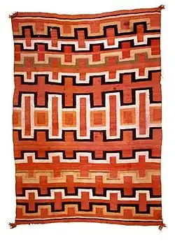 Les textiles navajos étaient à l'origine des couvertures utilisées comme manteaux, robes, couvertures de selle et à d'autres fins similaires. Vers la fin du XIXe siècle, les tisserands ont commencé à fabriquer des tapis pour le tourisme et l'exportation. Les textiles navajos typiques ont de forts motifs géométriques. Il s'agit d'un textile tissé de tapisserie plat produit d'une manière similaire aux kilims d'Europe de l'Est et d'Asie occidentale, mais avec quelques différences notables. Dans le tissage navajo, la technique de tissage fendu courante dans les kilims n'est pas utilisée, et la chaîne est une longueur continue de fil, ne s'étendant pas au-delà du tissage en une frange. Les commerçants de la fin du XIXe et du début du XXe siècle ont encouragé l'adoption de certains motifs kilims dans les dessins navajos.