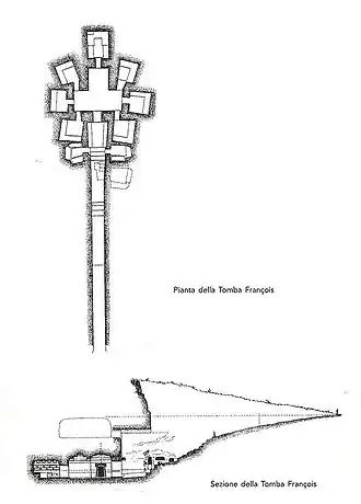 La tombe François est surtout connue pour son cycle de fresques, qui combinait des thèmes de la mythologie grecque (en particulier des cycles troyen et du thébain) avec des thèmes de l'histoire héroïque locale, dans un contexte substantiellement anti-romain[6]. Les scènes sont comparées les unes aux autres avec des intentions analogiques, pour exprimer le concept de vengeance et de rédemption. Les fresques se réfèrent surtout aux guerres entre les Étrusques et les Romains, ces derniers représentés de manière négative, mais aussi aux luttes entre les différentes cités étrusques.