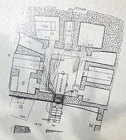 L'accès aux tombes se fait par une cour à ciel ouvert. Une ouverture monumentale est taillée sur le côté ouest de la cour. Cette façade à distyle in antis présente deux colonnes et deux pilastres carrés. De cette façade, il ne subsiste que les bases des colonnes. Derrière la façade, un long vestibule donne accès à quatre systèmes de tombes. Un cinquième est accessible directement à partir du côté nord de la cour[10].