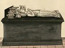 Ce monument est fort connu aux environs de Loches. C’est une statue d’albâtre allongée sur un large socle de marbre noir, dont certaines faces portent en épitaphe des inscriptions sculptées en ce Moyen Âge s’achevant et dont les lettres gothiques autrefois dorées disent[1] :