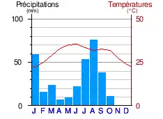 | Température moyenne (°C) | 22 | 25,5 | 28 | 31,5 | 34,5 | 34,5 | 31,5 | 29,5 | 31 | 31,5 | 27,5 | 22,5 | 29 |